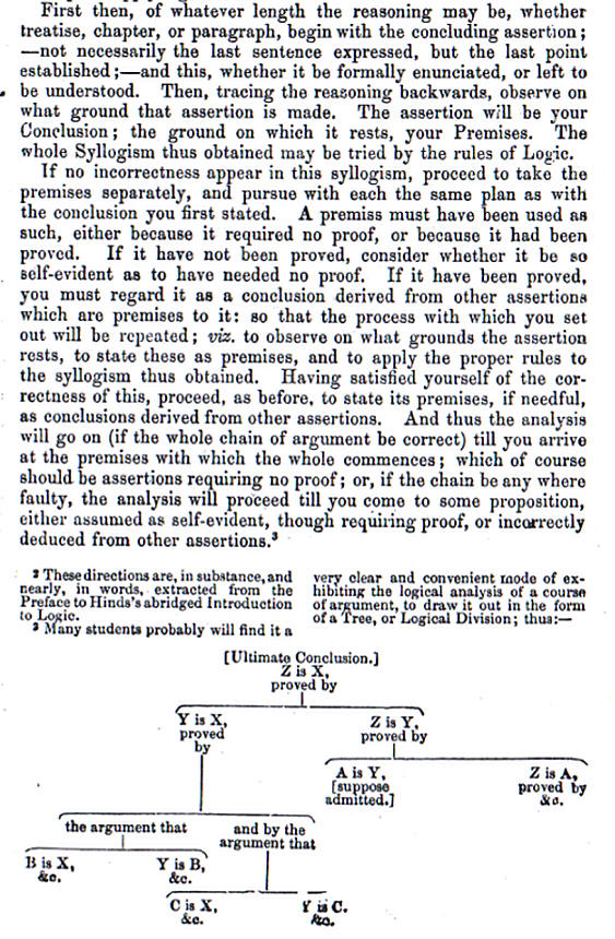 This is the only diagram in Whately’s Elements of Logic which is close to an argument map. Note that it is an argument map schema or template rather than an argument map. Whately’s comment “Many students probably will find it a very clear and convenient mode of exhibiting the logical analysis of a course of argument, to draw it out in the form of a Tree, or Logical Division” suggests that the practice of argument mapping did exist at that time.