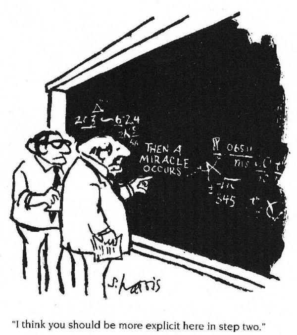 Just as there are complex formula either side of the crucial “step two” on the blackboard, so business intelligence suites, it seems, provide technical power either side of the “miracle” of human deliberative decision.