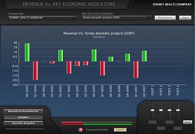 To illustrate with an example drawn from a later part of TE’s presentation: using a nifty Business Objects component, he shows a chart of Disney corporate revenues over a few years. He then puts on the same chart a line showing the performance of the US economy over the same period; and he then shows the difference between the two: